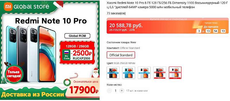 Чтобы забрать Redmi Note 10 Pro за 17.9 кэсов, залетайте по ссылке на Али и оформляйте заказ с промокодом RUOXP2500. Количество устройств ограничено, и по такой цене их наверняка разберут очень быстро.