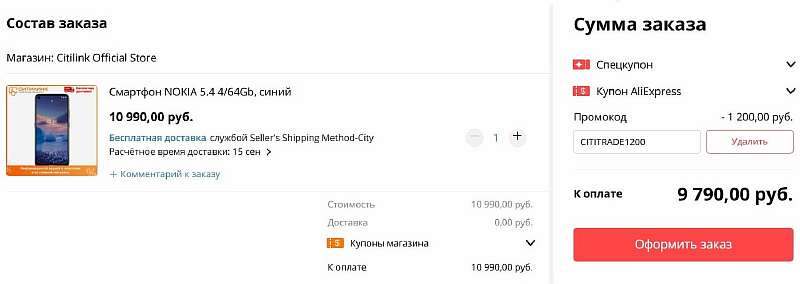Чтобы забрать Nokia со скидкой, применяйте промокод CITITRADE1200 при оформлении заказа на Tmall. Правда, стоит учесть один момент – смарт доступен к покупке только в тех городах, где есть офлайн магазины Ситилинка.