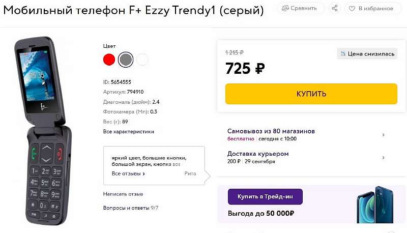Ритейлер устроил распродажу кнопочной звонилки F+ Ezzy Trendy. Это ностальгический аппарат в популярном для начала нулевых форм-факторе раскладушки. В обычное время модель стоит 1 215 рублей, но по акции ее сливают за 725 рубликов.