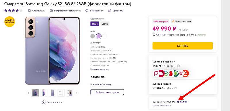 Как работает эта схема. По трейд-ину цена Samsung Galaxy S21 падает до 39 990 рублей, и уже от этой суммы отнимается цена старого телефона, который вы отдаете в придачу. Можно сдать абсолютно любой девайс: с разбитым экраном или не включающийся, и все равное сработает скидка за участие в трейд-ине. Ну а если это будет относительно актуальне устройство в нормальном состоянии, экономия будет более существенной. К тому же сдавать можно сразу несколько телефонов.