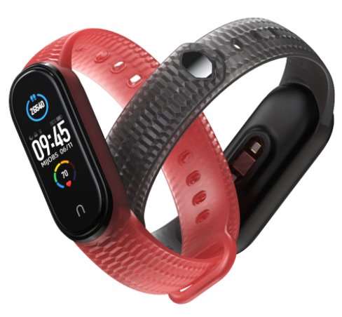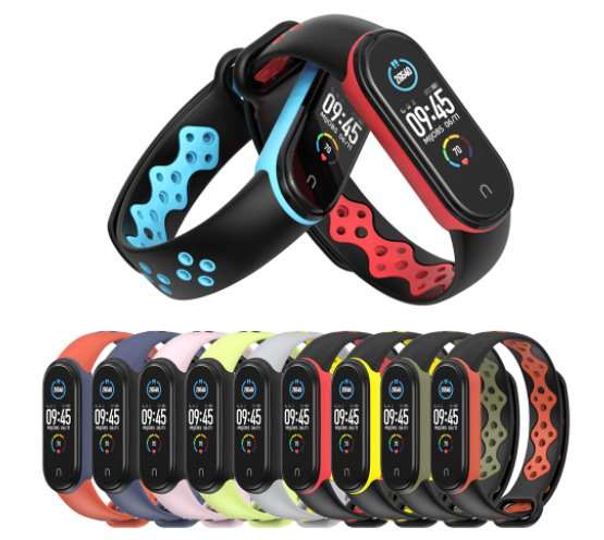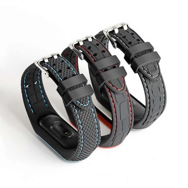 Для тех, кому нравятся ремешки от обычных электронных часов, есть возможность приобрести похожие для своего Mi Band 5. Они черные, но прошиты цветными нитками с соответствующей окантовкой вокруг капсулы. С часовой застежкой трекер удобно фиксируется на руках любого размера. Материал, из которого сделан ремешок — мягкий силикон, покрытый узором на внутренней и внешней стороне. Доступен 21 вариант сочетания цвета и узора на выбор.