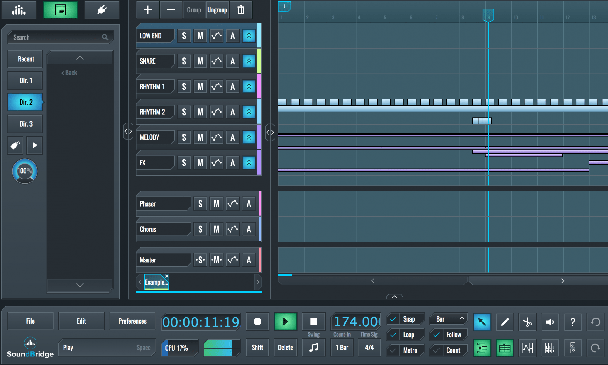 Еще одно неплохое бесплатное приложение для создания музыки – SoundBridge. Главной особенностью софта является возможность использования собственных плагинов. Это серьезный козырь, ведь обычно такая функция встречается лишь в платных секвенсорах. Отличается от конкурентов SoundBridge и тем, что здесь неограниченное число аудио дорожек, что позволяет создавать крутые и сложные биты.