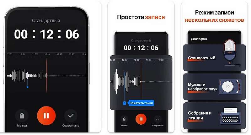 Запись возможна в нескольких режимах: стандартный для голоса, музыка, собрания и лекции. Получившиеся файлы можно прослушивать на разной скорости, обрезать, пересылать по соцсетям и мессенджерам. Записывать можно в фоновом режиме, с выключенным экраном, ограничений на размер файла нет.