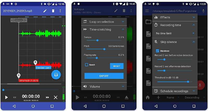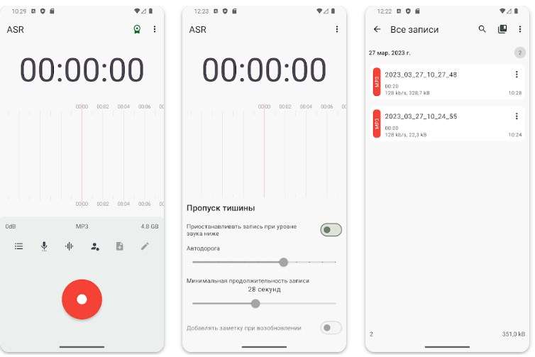 ASR Sound Recorder — лучший бесплатный диктофон на Андроид. И этого звания он удостоился за свою универсальность. Диктофон всеяден и поддерживает большое количество форматов: MP3, FLAC, WAV, OGG и M4A. Базовый набор в виде качественной записи звука дополняет ворох мелких, но очень полезных функций. Это и редактирование записей, и подавление эха, и пропуск тишины.