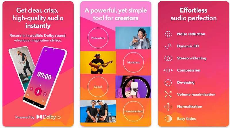 Какой диктофон скачать на Андроид, чтобы использовать для записи музыки? Тут выбор однозначен – Dolby On. Это одно из немногих приложений, которое поддерживает технологию кодирования Dolby, с ней голос и инструменты будут звучать так, как будто их записывали на профессиональной студии. Усиления, фильтры, наложение эффектов, эквалайзер, возможность убрать шумы – есть где разгуляться людям, разбирающимся в вопросе.