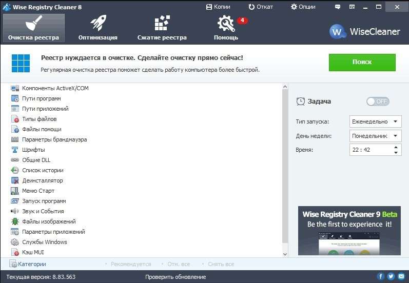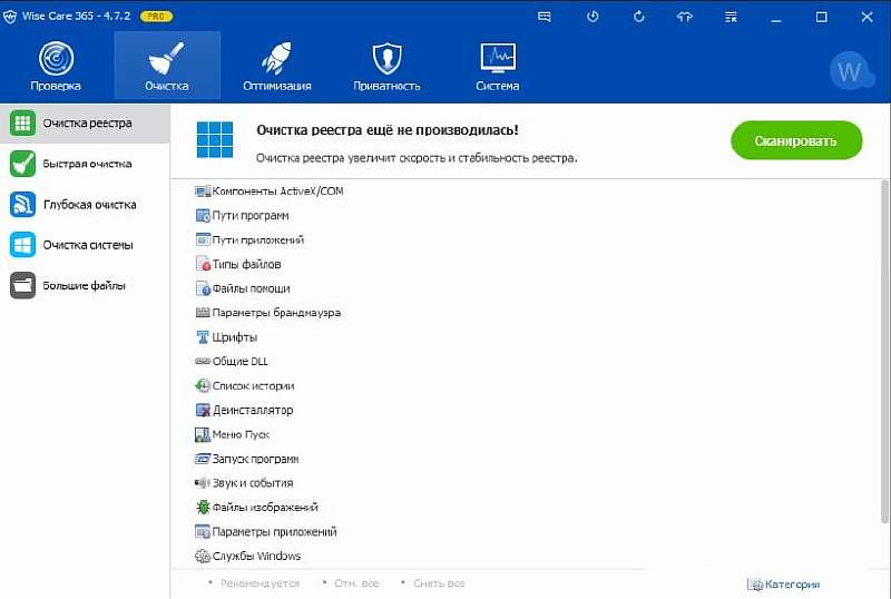 Программа Wise Registry Cleaner обладает базовым набором функций по оптимизации ПК и работе с реестром. В шапке сверху находится три вкладки: очистка, оптимизация и сжатие реестра. Первая из них позволяет очистить систему от всевозможного мусора, накопившегося в процессе эксплуатации компьютера.