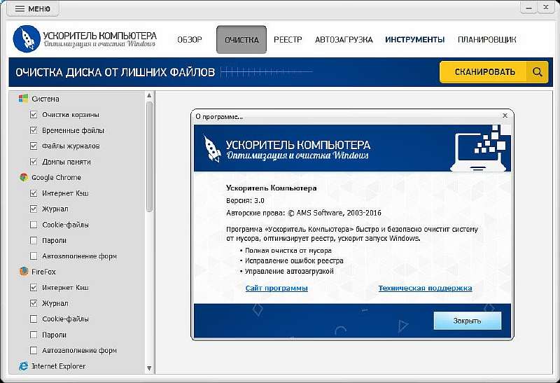 Программа с прямолинейным названием Ускоритель Компьютера обладает богатым функционалом и при этом крайне проста в освоении. Для полной оптимизации компьютера достаточно запустить анализ состояния ПК, а по окончании проверки нажать «исправить всё», что сможет сделать даже самый неопытный пользователь.