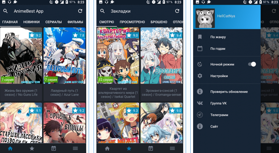 Приложение на телефон для просмотра аниме AnimeBest может похвастаться сразу несколькими достоинствами. Во-первых, оно бесплатное и совсем без рекламы, так что вам не придется платить или искать взломанное приложение. Во-вторых, AnimeBest мало весит и имеет лаконичный интерфейс с темной темой и даже ночным режимом. В базе более 3000 тысяч аниме от старых до самых новых.