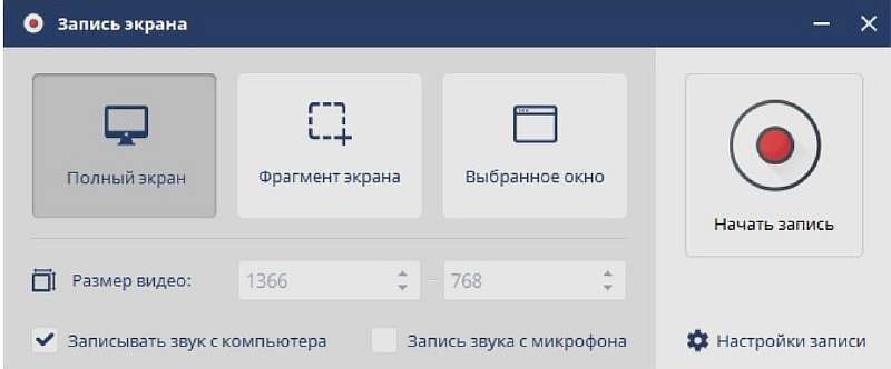 - запись полного экрана ПК, определенного фрагмента и выбранного окна;