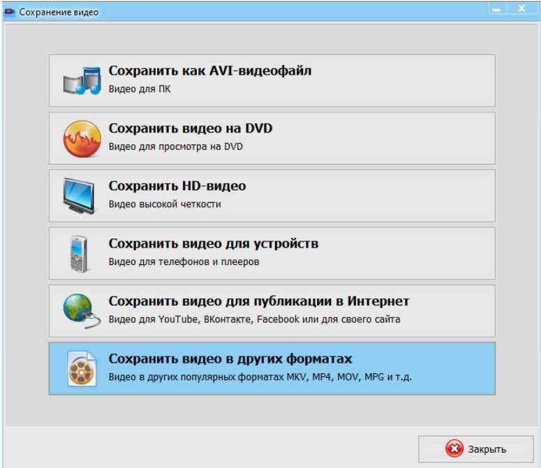 Кликните «Сохранить видео» под окном предпросмотра. Выберите вариант экспорта «Сохранить видео в других форматах» и подберите подходящее расширение. Следуйте подсказкам программы, чтобы завершить конвертирование файла.