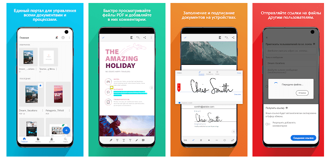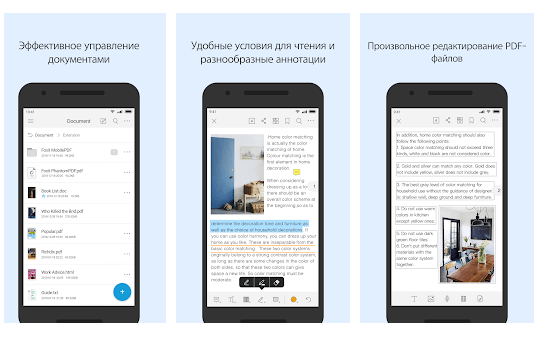 Компания Adobe создала формат PDF, поэтому нет ничего удивительного, что ее же программа является одним из самых продвинутых инструментов для его чтения. В приложении реализован удобный импорт материалов из облачных и локальных хранилищ, есть возможность печати и быстрого добавления заметок. При необходимости через этот PDF ридер для Андроид вы сможете заполнить и подписать форму, разметить текст, отредактировать файлы с общим доступом или ответить на комментарии, которые оставили в них ваши коллеги.