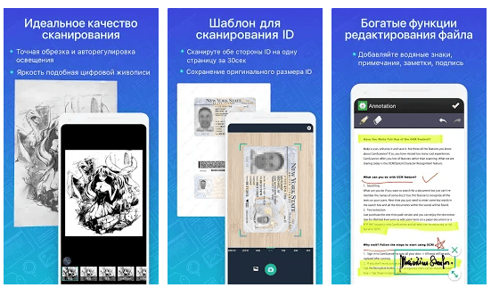CamScanner стоит рекомендовать пользователям, которым часто приходится переводить печатные сертификаты, договора и прочие важные бумаги в PDF файлы. Приложение использует для сканирования камеру смартфона и за счет продвинутых алгоритмов обработки выдает детализированный и четкий текст. С помощью программы удобно делиться документами — достаточно нажать пару кнопок, и вы сможете отправить файл коллеге через мессенджер или на почту.