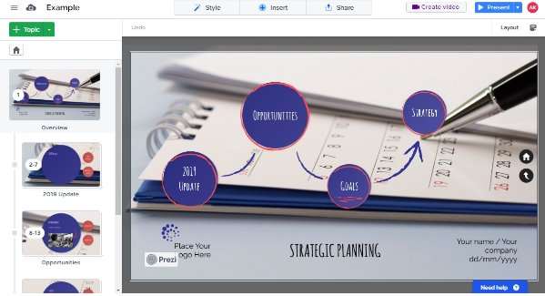 В данной программе для создания презентаций вы не встретите привычный ряд слайдов. Основная фишка — интерактивное представление: на одном крупном слайде размещены все элементы, и при демонстрации камера перемещается от одного участка к другому. За счет приближения, движения объектов и анимированного фона вы сможете держать внимание аудитории до конца показа.