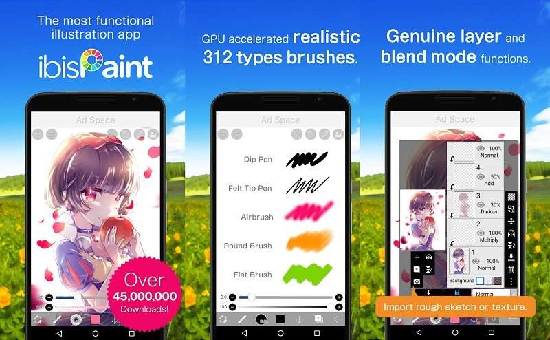 Среди бесплатных приложений для рисования на Андроид ibis Paint X занимает почетное первое место. Во многом благодаря своей производительности — программа шустро работает на любых мобильных устройствах, а рисование ощущается плавным и комфортным. Среди инструментов ibis Paint X 312 видов кистей, включая DIP-ручки, фломастеры, цифровые ручки, воздушные, вентиляторные щетки, плоские кисти, карандаши, мелки, штампы. Не менее разнообразны здесь и холсты. По своей функциональности приложение может потягаться с редакторами для ПК.