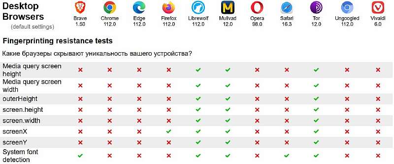 Только Librewolf, Safari и Mullvad полностью защищают нас от утечки «отпечатков», на удивление ни Brave, ни Firefox не справляются с этим хорошо. Каждый из них блокирует только один из параметров, Chrome, Edge и Vivaldi — ни одного.