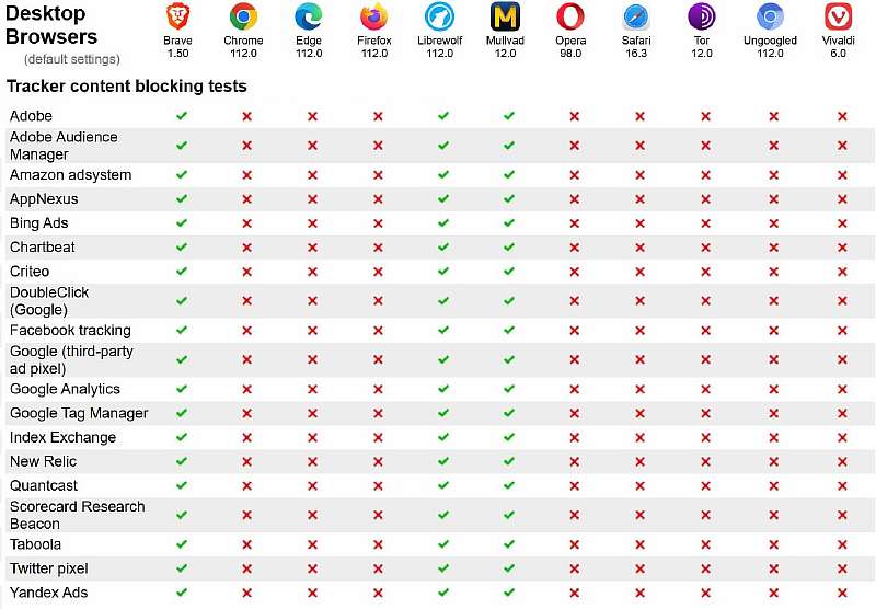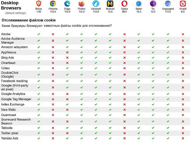 По умолчанию Сookies запрещают отслеживать большинство браузеров: Brave, Firefox и его клоны (Librewolf, Mullvad), Safari. Edge отрабатывает лишь частично, а вот Chrome и Opera вновь проявили себя с худшей стороны. Это не удивительно, поскольку Google зарабатывает на интернет-рекламе, и защита приватности пользователей по сути противоречит бизнес-интересам компании.
