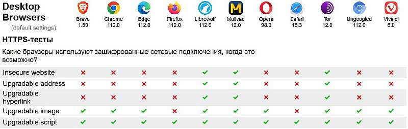 Принудительно используют HTTPS соединение и блокируют небезопасные сайты Safari, Librewolf и Mullvad. Остальные браузеры отображают все, как есть.