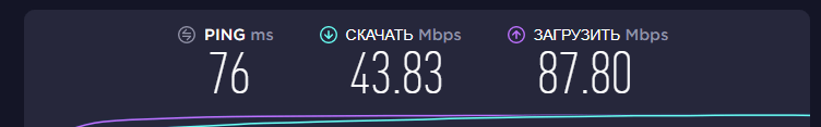 На изображении скорость загрузки составляет 87.8 Мб/с (87 800 кб/с). Это более чем приемлемый результат, которого хватит для трансляции в высоком качестве. Такие значения можно получить на тарифе с номинальной скоростью 200 мбит/c.