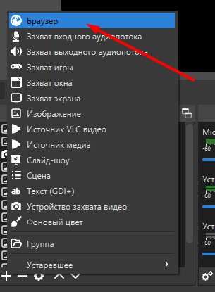 - Запускаем приложение, выбираем сцену и добавляем источник – Браузер.