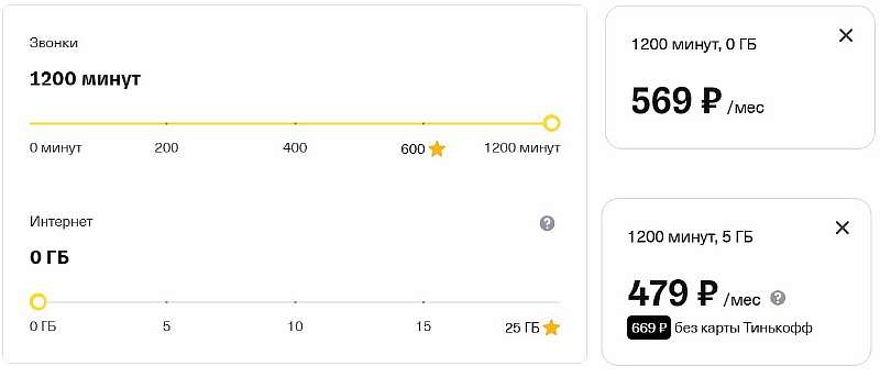 Однако, если у вас есть карта Тинькофф, этот же тариф будет стоить 379 рублей в месяц, поскольку минуты дадут бесплатно. Клиентам банка можно сразу идти в конструктор тарифов и выкрутить минуты на 600 – ценник не изменится.