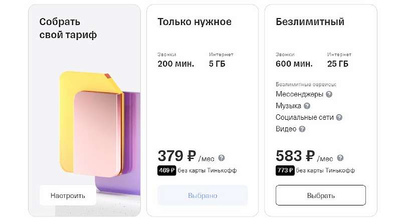 У Тинькоффа есть главный конструктор тарифов, который можно отрегулировать под себя. Также оператор предлагает два готовых тарифных плана – «Только нужное» и «Безлимитный», которые по сути являются готовыми настройками этого конструктора.