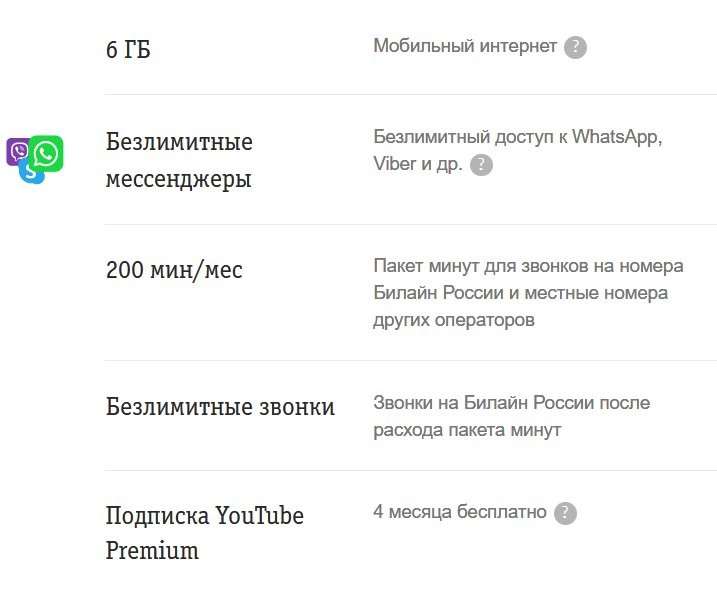 За 16,66 рублей в сутки или же 500 рублей в месяц (Москва и Московская область) абонент получал 600 минут звонков на номера любых операторов, безлимитные звонки на «Билайн» (активировались только после того, как общий пакет кончится), 6 ГБ интернет-трафика и безлимитные приложения мессенджеров (WhatsApp, Viber, ICQ, Skype, Snapchat).