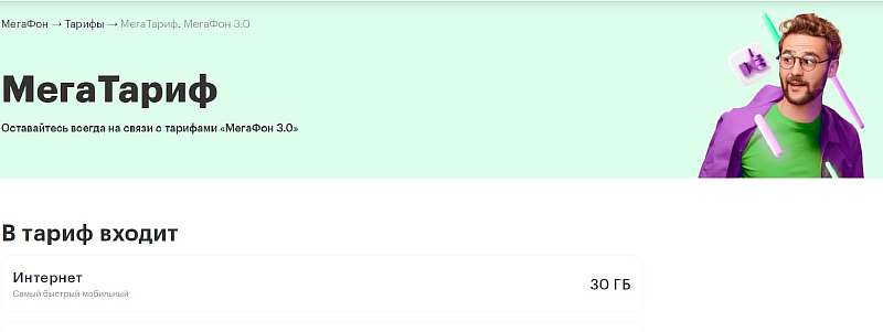 Настало время разобраться с МегаФон. Какой тариф лучше для интернета у «зеленых»? Недавно компания переименовала линейку «Без переплат», которая теперь называется «МегаФон 3.0», и «МегаТариф» оттуда — достойный крепкий середняк. За 750 рублей в месяц абоненту достанется: