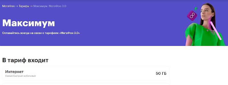 Второй кандидат из той же линейки «МегаФон 3.0». «Максимум», как понятно из названия, готов предложить солидные пакеты трафика и минут. За 900 рублей в месяц абонент получит: