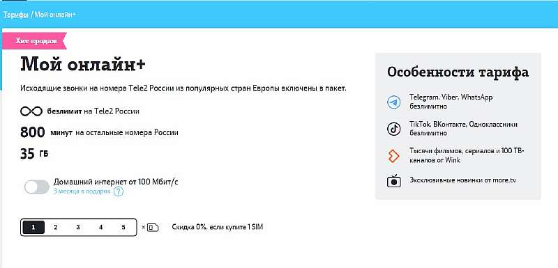 Не проблема найти относительно выгодный мобильный тариф с интернетом и у компании Tele2. У клиентов этого оператора пользуется популярностью «Мой онлайн+». Стоимость: 700 рублей в месяц, за которые абоненту достанутся:
