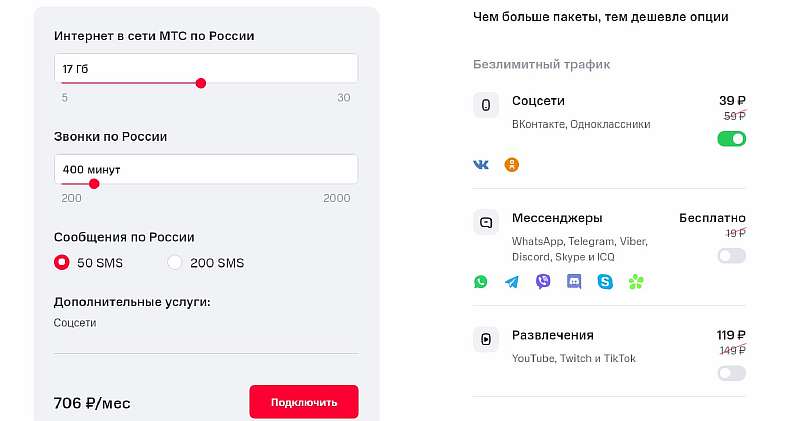 Цена дополнительных услуг не фиксирована. Чем крупнее выбранные пакеты минут и интернета, тем дешевле окажутся опции. К примеру, при выборе 20 ГБ интернета безлимитные мессенджеры станут бесплатными, а соцсети обойдутся уже в 39 рублей. Стоит учитывать этот момент, если хотите подключить больше сервисов, не переплачивая.