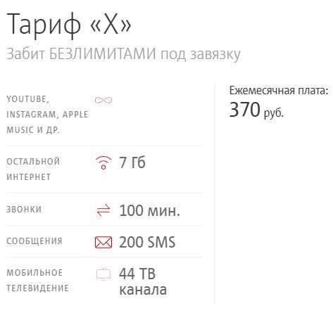 Загадочный тариф X — это не что иное, как переименованный тарифный план «Хайп» с ровно теми же условиями. Рассчитан он на активных пользователей социальных сетей, среди которых можно найти: «ВКонтакте», «Одноклассники», Facebook, Twitter, Skype, WhatsApp, Viber, Snapchat, YouTube, Яндекс.Музыка, Zvooq, Twitch — трафик на использование которых не учитывается Вдобавок к этому опция предоставляет мобильное телевидение и дополнительные 7 ГБ трафика, которые можно потратить по своему усмотрению, если нужно больше — каждые новые 500 Мб обойдутся в 95 рублей.
