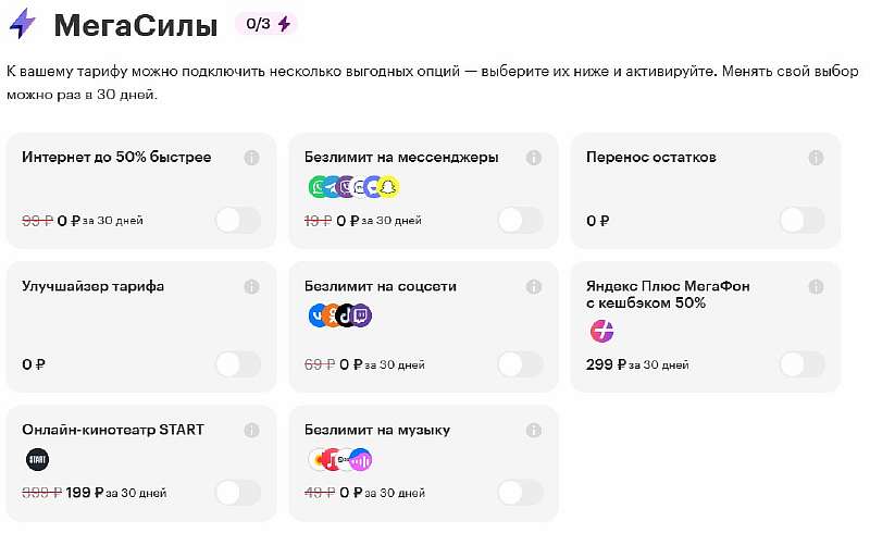 Для «МегаФон 3.0. Минимум» доступен целый ряд улучшайзеров («МегаСилы), с помощью которых можно дополнительно прокачать тариф. Бесплатно дают выбрать 3 из 6 опций: