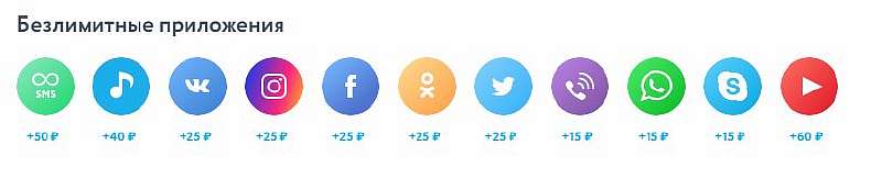 Наиболее интересной в тарифе «0 ГБ» является возможность подключения безлимитного доступа к приложениям, стоимость которого начинается от 10 р, в зависимости от региона. На выбор доступны следующие сервисы (цены актуальны для Москвы):