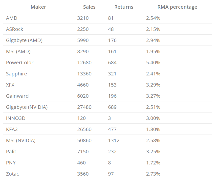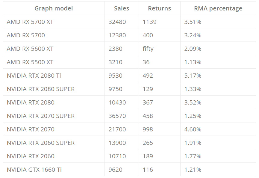 Мы нашли интересную статистику за 2020 год от крупнейшего немецкого магазина Mindfactory, в которой указаны продажи (Sales) видеокарт, возвраты (Returns) из-за брака или неудовлетворенности, и процент возвратов по отношению к продажам (RMA):