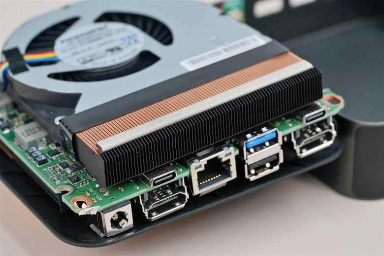 Система охлаждения здесь очень похожа на ноутбучную, она включает один массивный вентилятор с двумя тепловыми трубками. Учитывая невысокий теплопакет процессора и хорошую продуваемость корпуса, со своими задачами охлаждение справляется. Температура в стресс-тесте не превышает 74 °С.