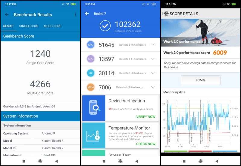 Redmi 7 оснащен чипсетом Snapdragon 636, это 14-нанометровый процессор с графическим ускорителем Adreno 506, который работает на тактовой частоте 1.8 ГГц. В сравнении с шестым поколением серии, которое строилось на базе Helio P22, прирост производительности получился достаточно существенным. В тестах AnTuTu и GeekBench телефон демонстрирует следующие результаты: