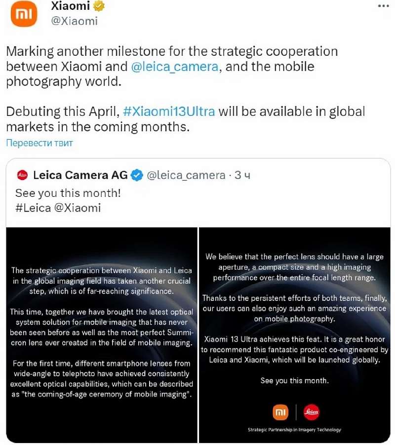Генеральный директор Xiaomi еще в прошлом году пообещал, что в отличие от Xiaomi 12S Ultra, который продавался только в Китае, преемник будет доступен и на мировом рынке. Когда? Компания уже анонсировала, что выпустит новый камерофон до конца апреля.