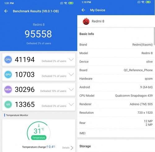Redmi 8 работает на восьмиядерном процессоре Snapdragon 439, что является шагом назад относительно SD636 в Redmi 7. Такой же чипсет используется в 8A, однако в базовой конфигурации старшая модель имеет на 1 ГБ оперативки больше.