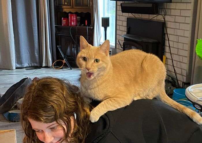 Кошка залазит на спину любого, кто наклонится рядом с ней